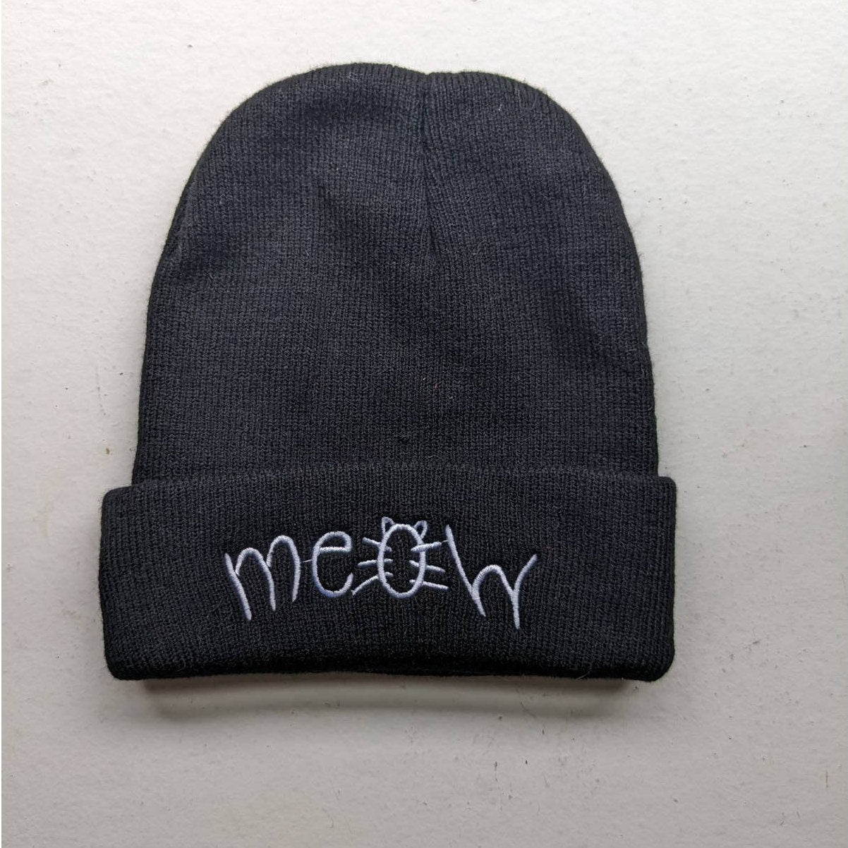 Absolutely adore this one, y'all need to scoop this up before I wind up keeping! 90s grunge does minimalist indie kid vibes. Mega cute all black stretchy knit beanie with Meow embroidered in white kids handwriting style. Can we talk about the little whiskers and ears? Love!! My baby girl CoCo Chanel, the fluffiest most adorable foster fail calico bean, approves of this message. Has good stretch and a snug but comfy fit. Gently used, in excellent condition.
