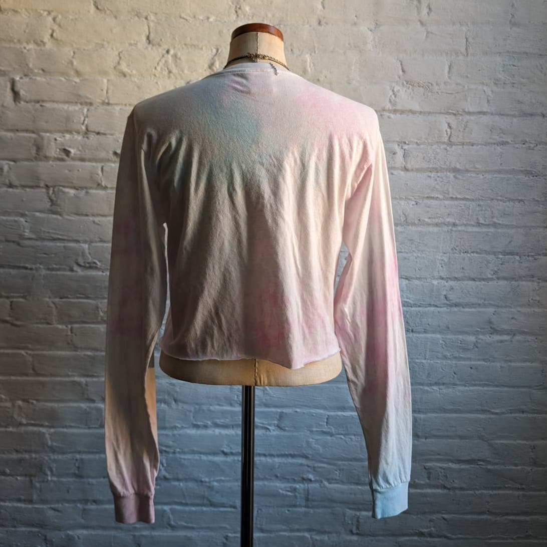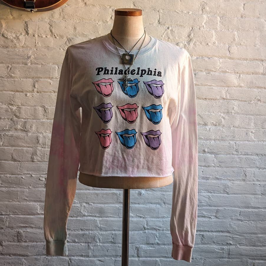 Are you with the band? You could be with this dope little super soft 100% cotton Philly tee! 70s rock n roll girlfriend does streetwear skater girl with a side of grateful dead tie-dye vibes. Iconic Rolling Stones hip lips graphic print is giving mad Warhol. Groovy pastel cotton candy colorway in bubblegum pink, sky blue and lilac purple. Graphic has a soft barely there burnout feel. Philadelphia spellout. Oversize relaxed fit, raw cropped hem. Like new. NWOT.