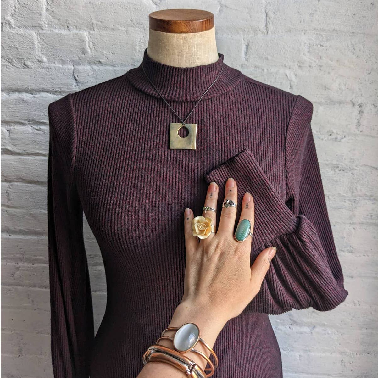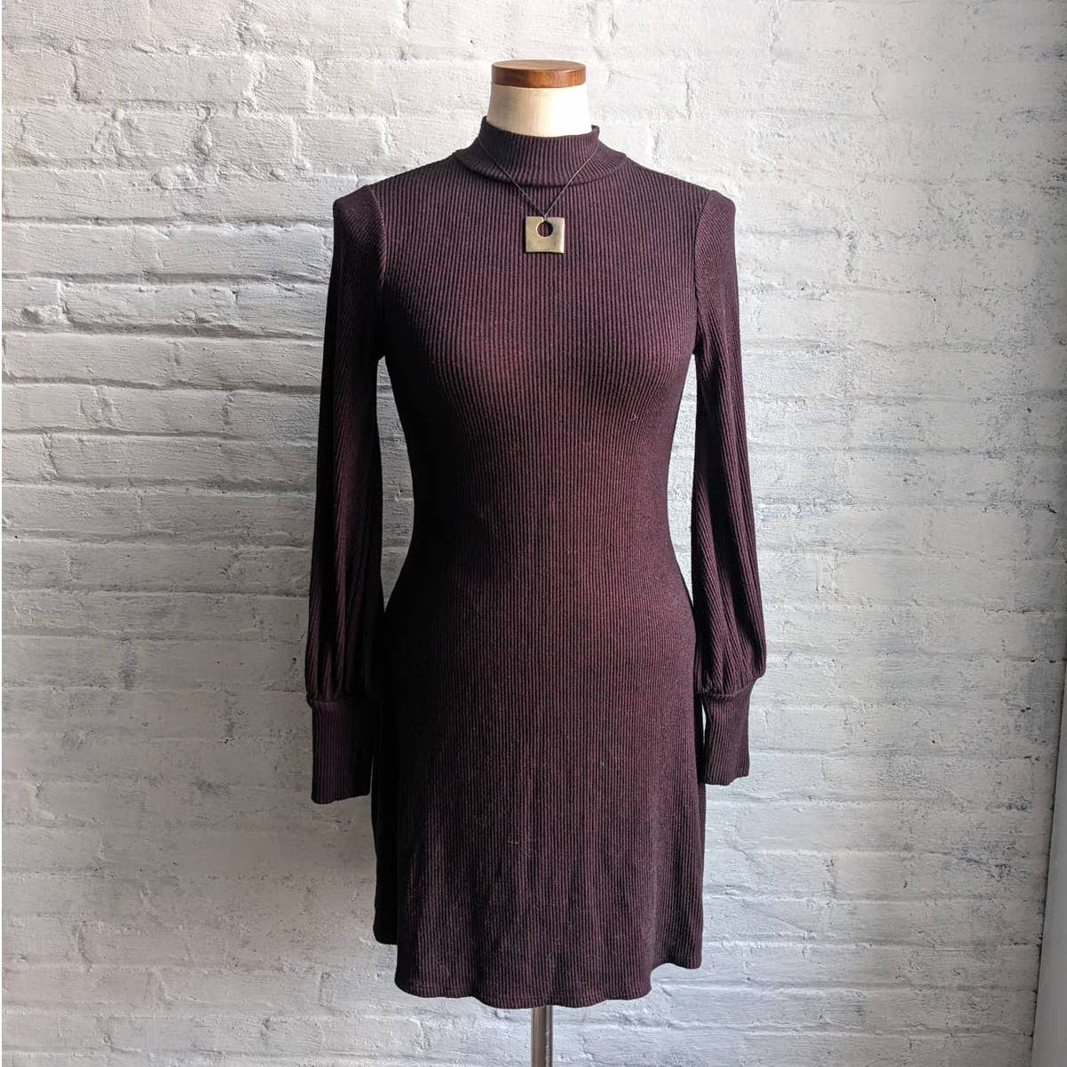 Looove! Earthy fairy chic does romantic grunge vibes. Gorgeous dark academia bohemian mock neck flared hem dress. Heathered deep muted purple maroon earth tones. Ribbed lightweight knit is soft and comfortable and perfect for layering. Slight balloon flare sleeve, has good stretch. Gently used, in excellent condition.