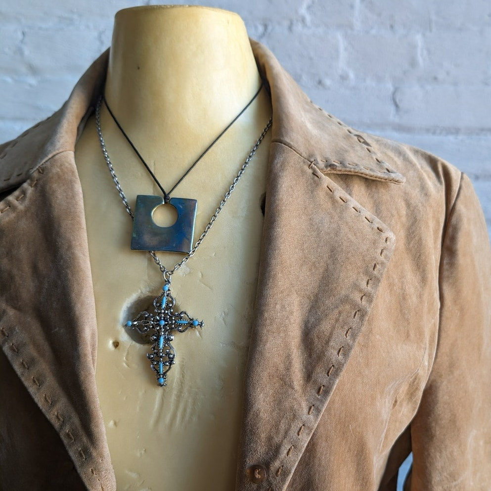 Obsessed!! Gorgeous groovy retro longline suede leather duster in earthy warm caramel tan tone. 70s almost famous rockstar girlfriend does 90s western cowgirl chic vibes. Super soft light to mid weight with gorgeous woven leather accents throughout. Sexy split collar, full button front, pockets! Perfect for festival season and year round wear. Minor scuffs and spots, some areas of woven leather are loose - see photos. Gently used, in good vintage condition.