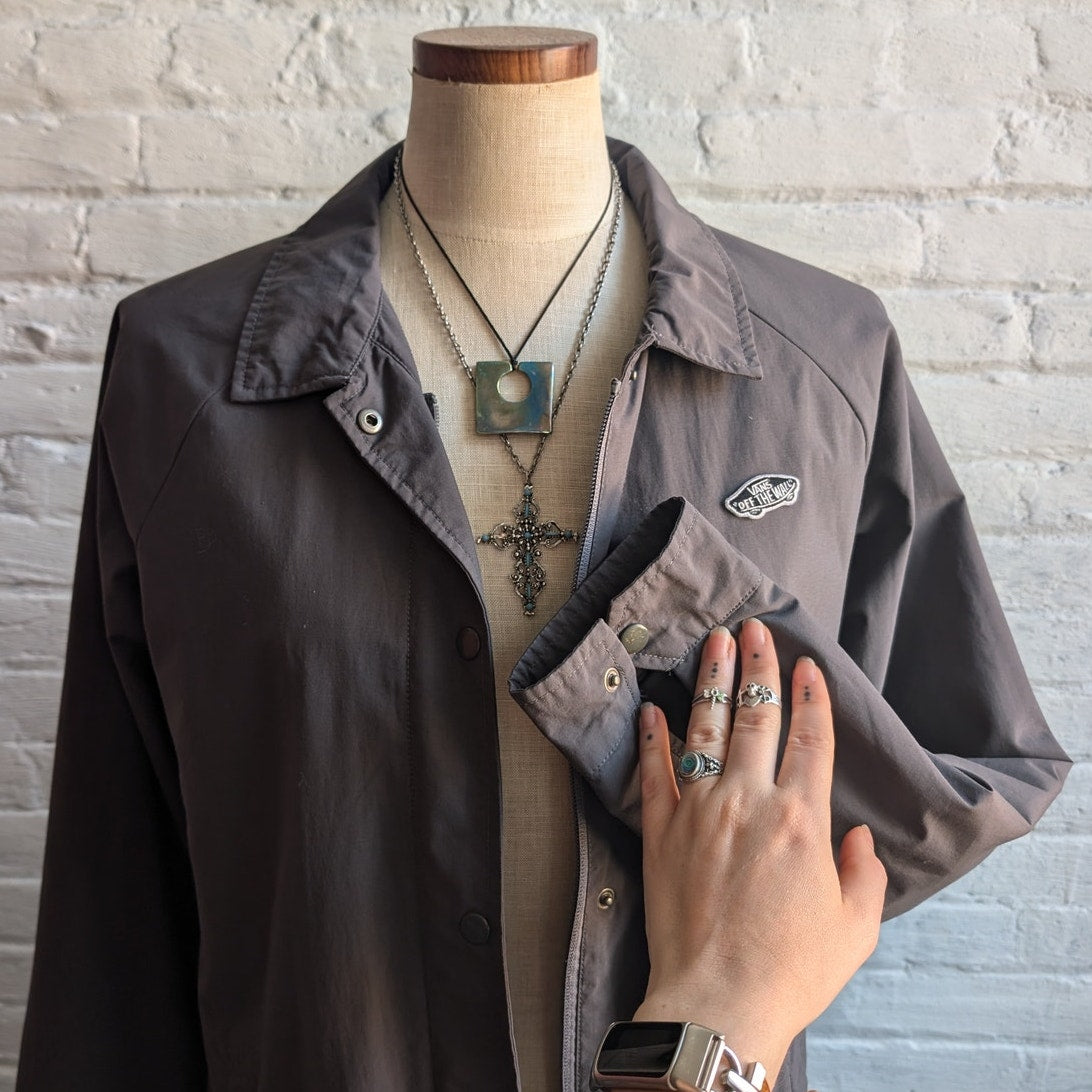 Shop favorite! Clean straight lines on this lightweight windbreaker feel stone gray utility skate jacket from Vans. 90s minimalist skater babe does retro workwear utility grunge vibes. Features iconic Vans logo patch on left chest, snap front closure with hidden zipper. Oversize, longline silhouette. Lightweight soft wind breaker feel perfect for layers and movement. Closet staple. Gently used, in excellent condition.