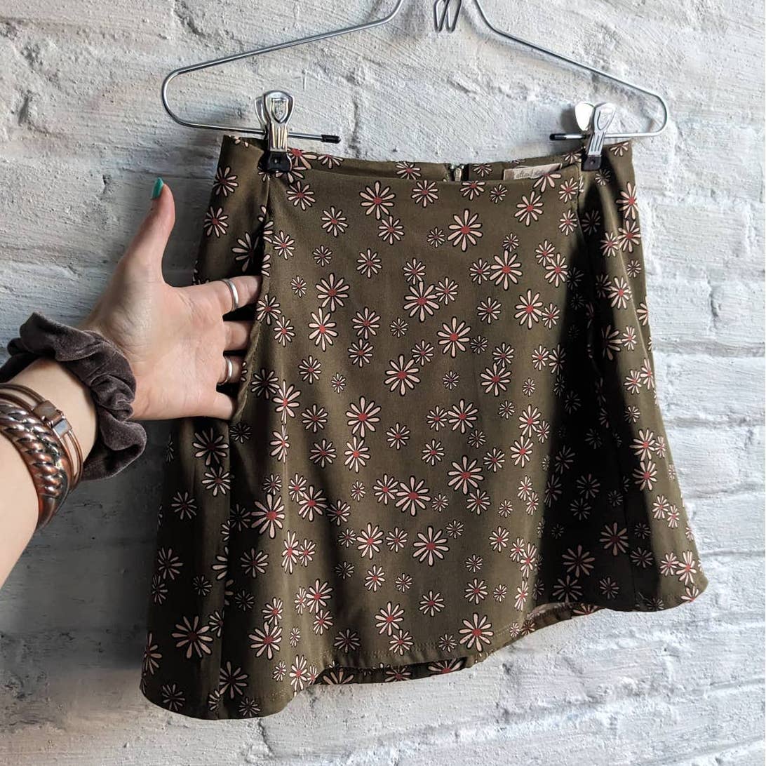 Loving this rad little flowy clueless mini skater skirt in mossy grunge green. She's got pockets too! Giving 90s skate babe does 70s sunshine psychedelic girlie. All over flower power daisy print in muted retro shades of rusty orange and washed out pastel pinky tan. Zipper back and pleated details. Gently used, in excellent vintage condition.