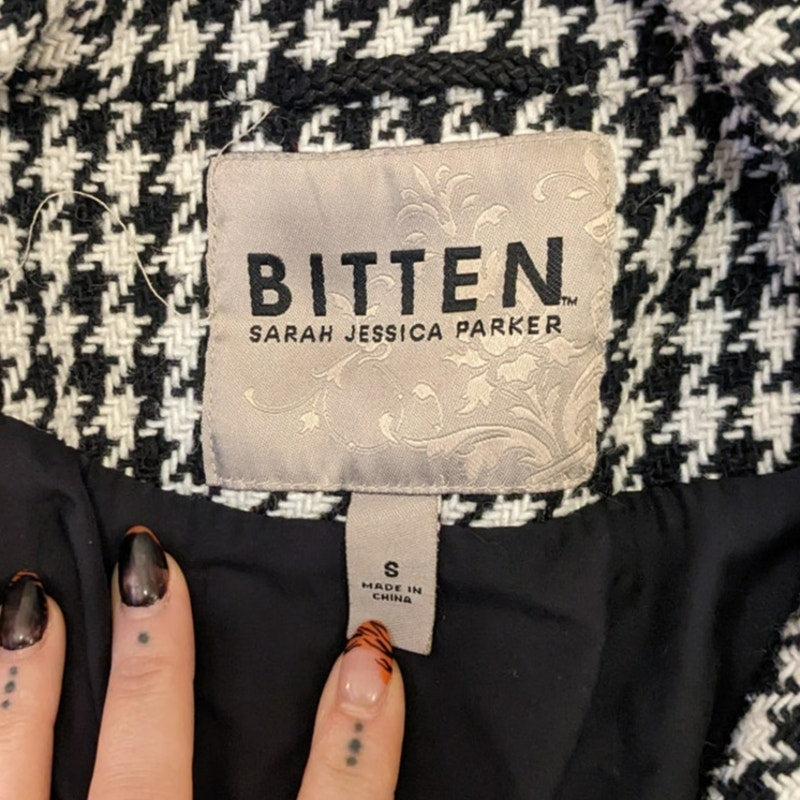 LOVE! It’s giving 90s preppy sex in the city baddie does Y2K whimsygoth light academia vibes. Dope little mini trench features a gorgeous mock neck collar, oversize button front closure and ruffle flared hem. Longline, fit flare silhouette with side pockets, structured shoulders. Woven knit wool blend in classic black and white houndstooth geometric pattern. Mid weight, perfect for layers. Small unraveled area on back shoulder + one replacement button, see photos. Gently used, in very good vintage condition.