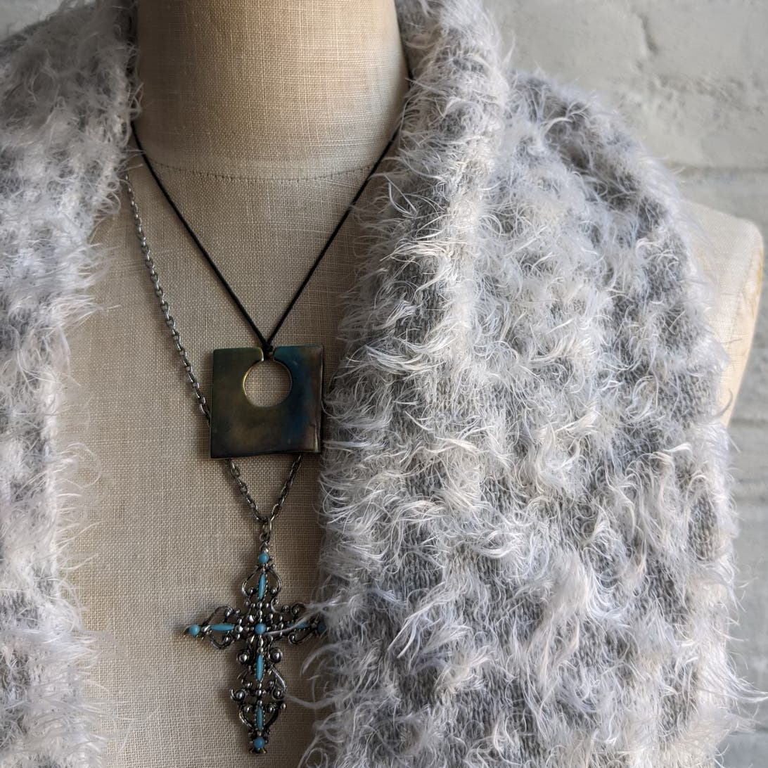 Such a wild piece that's perfect for layering. 70s Daisy Jones rock n roll girlfriend does ski bunny chic vibes. Feathery soft wispy shaggy fringe scarf in crisp white with muted silver grey leopard cheetah print throughout. Infinity design, baby soft and cozy feel. Oversize infinity design, has excellent stretch. Mid-weight, warm. Gently used, in excellent condition.