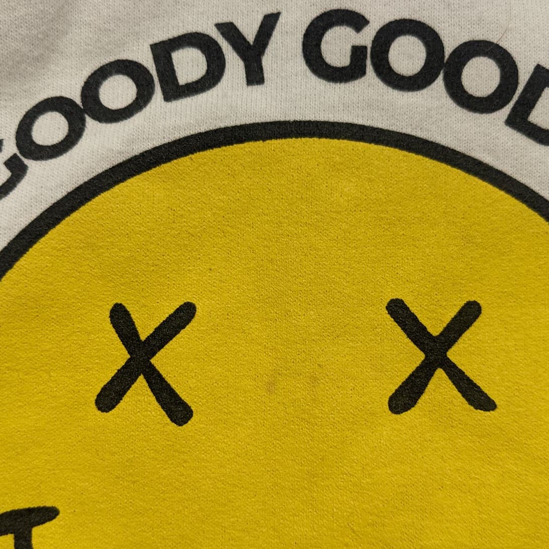 Loving this dope little streetwear inspired smiley graphic print hoodie. Major 90s graffiti street art does trippy burnout stoner babe vibes. GOODY spell out with color pop yellow drippy trippy smiley face on classic white. Slouchy longline silhouette. Front pouch to stash all yer treasure. Drawstring hood perfect for tucking away. Mid-weight cozy warm and soft. A few small faded out spots, some piling. Gently used, in good vintage condition.